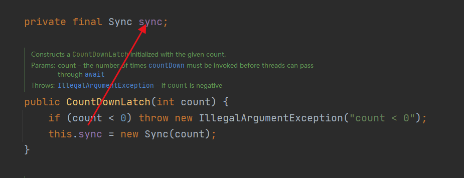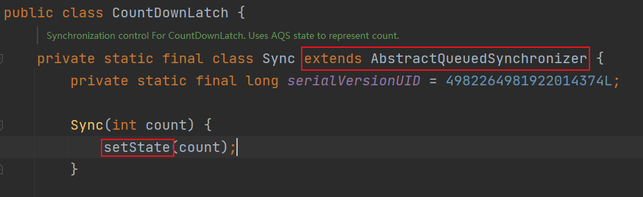 可以看到 CountDownLatch 类搞了个 Sync 的内部类并且继承了 AbstractQueuedSynchronizer ,在创建 CountDownLatch 的时候,通过本身的构造方法调了内部类的构造方法,其中有个方法 setState(count),此方法继承自 AQS ,说白了就是利用 AQS 实现的,关于 AQS 的分析有机会再说吧~