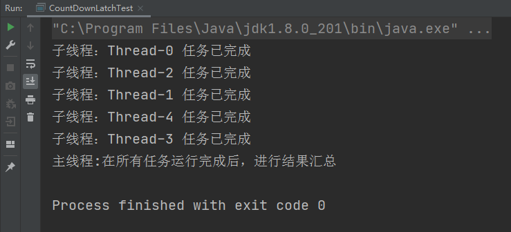 public static void main(String[] args) throws InterruptedException {         for (int i = 0; i < N; i++) {             new Thread(() -> {                 try {                                          System.out.println("子线程:" + Thread.currentThread().getName() + " 任务已完成");                     countDownLatch.countDown();                 } catch (Exception e) {                     e.printStackTrace();                 }             }).start();         }                  countDownLatch.await();                  System.out.println("主线程:在所有任务运行完成后,进行结果汇总");     } }