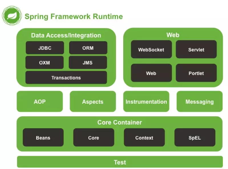 Spring框架至今已集成了20多个模块。这些模块主要被分如下图所示的核心容器、数据访问/集成,、Web、AOP(面向切面编程)、工具、消息和测试模块。